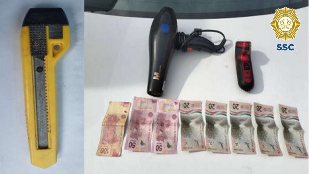 Ante esta situación, los uniformados iniciaron la búsqueda del posible responsable y tras una persecución, fue detenido y plenamente reconocido por el denunciante, por lo que, en apego al protocolo de actuación policial, le fue realizada una revisión de seguridad, tras la cual le aseguraron una rasuradora, una secadora de cabello, dinero en efectivo y un cúter de aproximadamente 15 centímetros de largo.